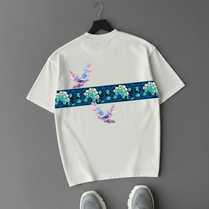 طرح کبوتر بهعنوان نماد صلح و آزادی، جلوهای هنری و متفاوت به لباس داده و رنگ آبی یخی آن باعث ایجاد استایلی خنک، مدرن و چشمنواز میشود. این مدل بهراحتی با انواع شلوار جین، اسلش یا استایل خیابانی ست میشود.