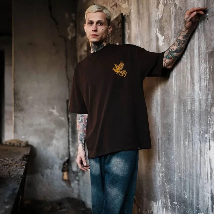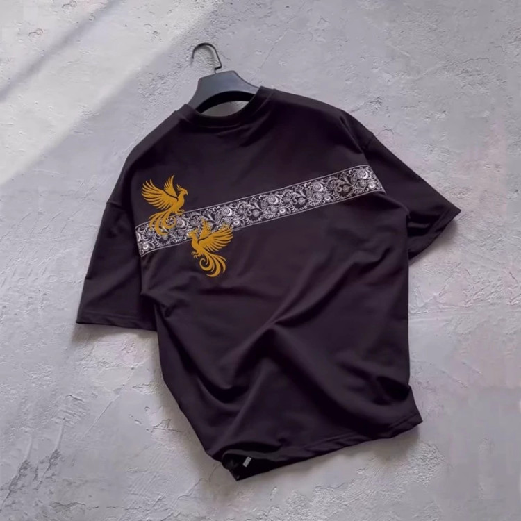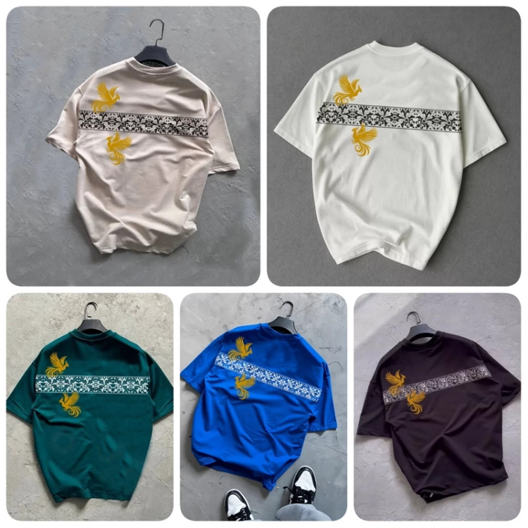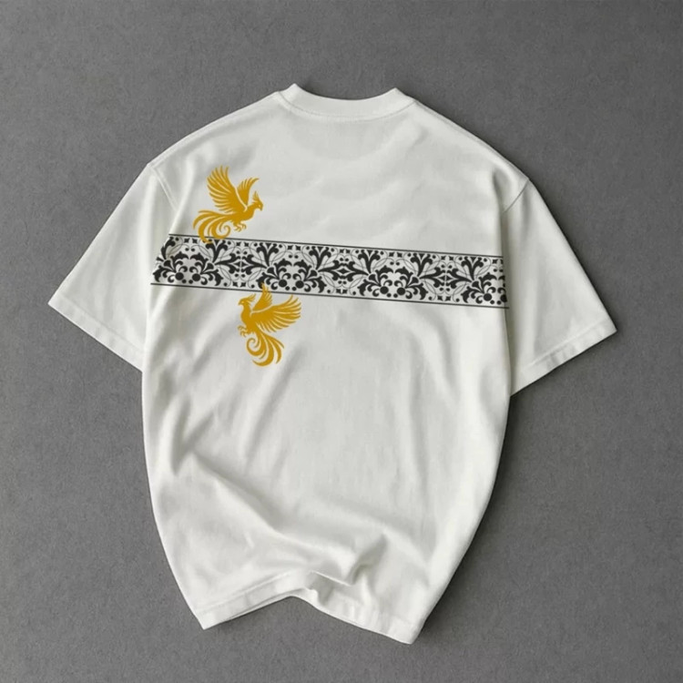 تیشرت مردانه و دخترانه قواره دار طرح ققنوس رنگ کرمی سایز L تا 2xl