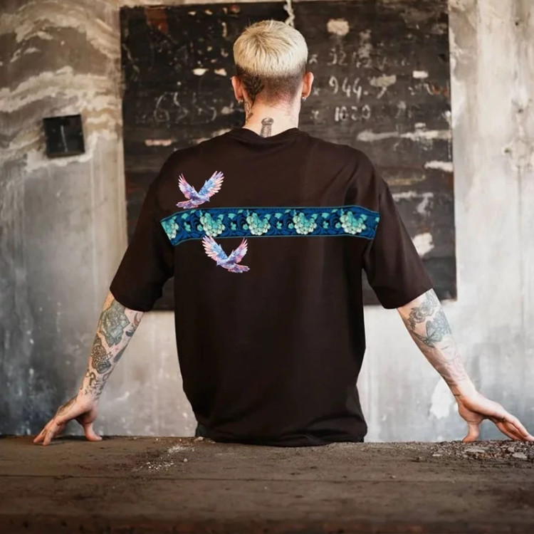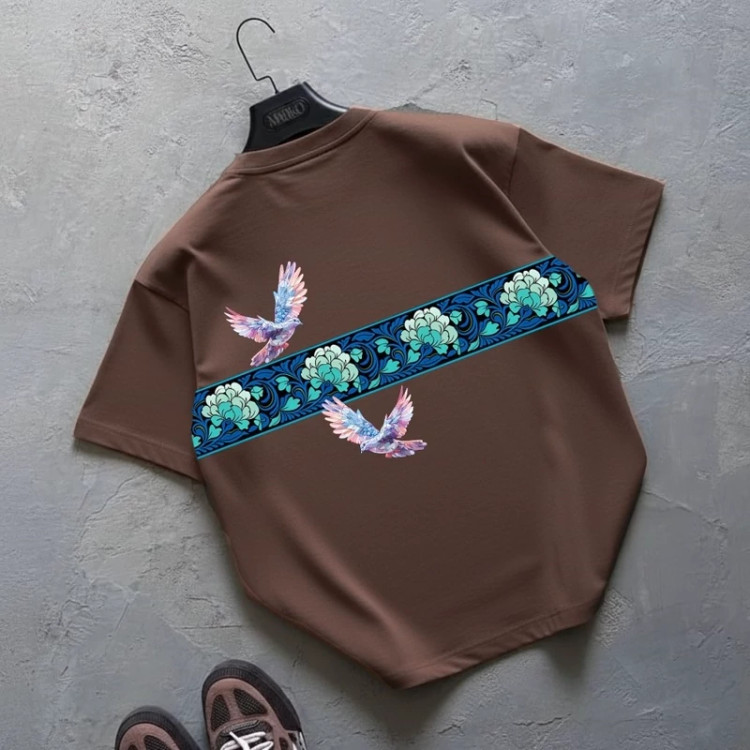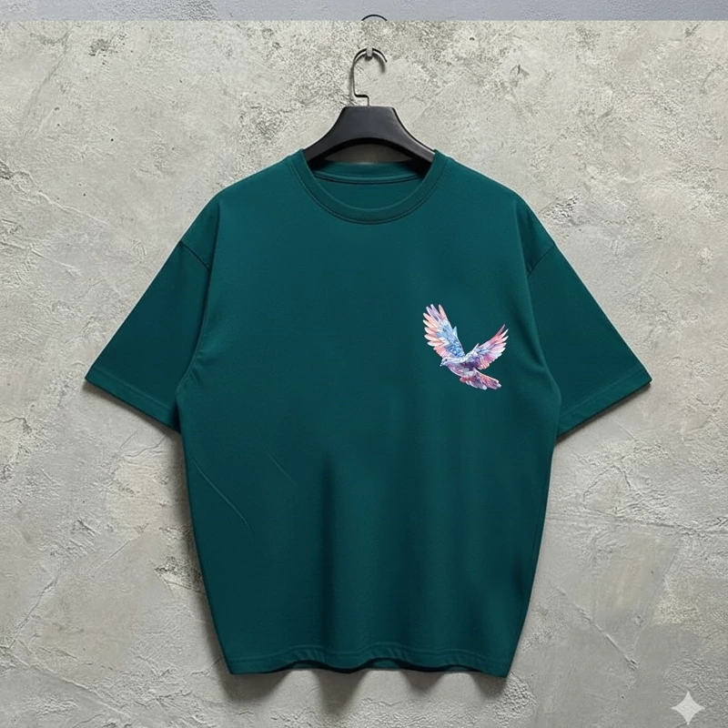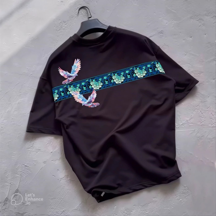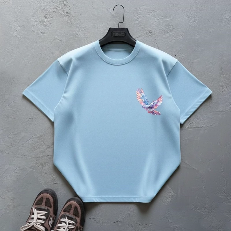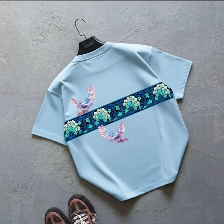 طرح کبوتر بهعنوان نماد صلح و آزادی، جلوهای هنری و متفاوت به لباس داده و رنگ آبی یخی آن باعث ایجاد استایلی خنک، مدرن و چشمنواز میشود. این مدل بهراحتی با انواع شلوار جین، اسلش یا استایل خیابانی ست میشود.