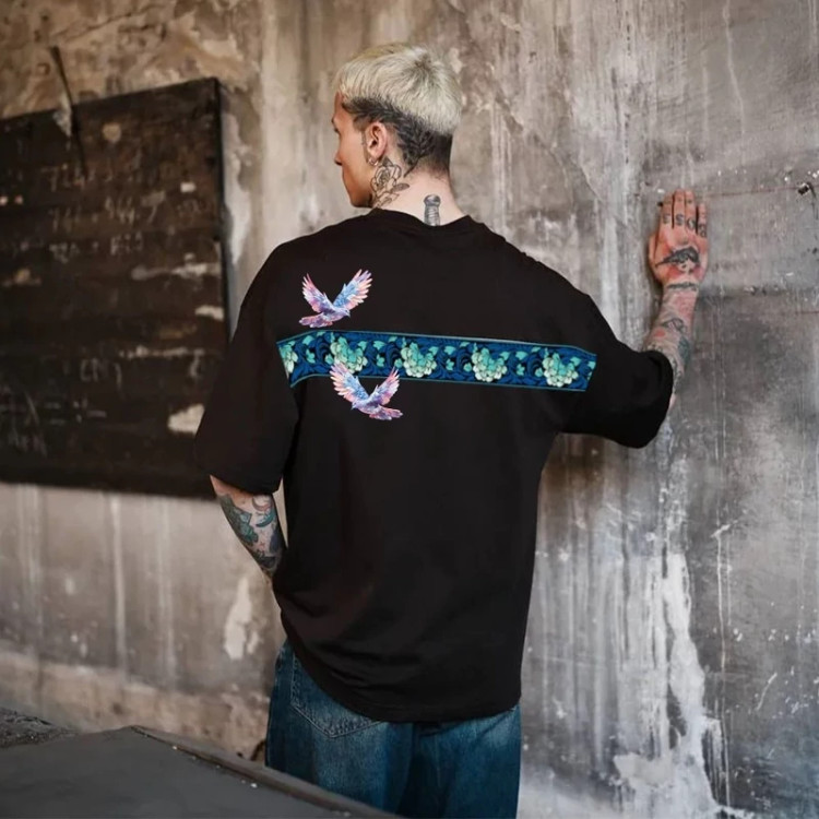 تیشرت قواره دار باکسی دونخ پنبه طرح کبوتر رنگ سفید سایز L تا 2xl