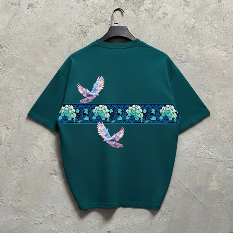 تیشرت قواره دار باکسی دونخ پنبه طرح کبوتر رنگ سبز سایز L تا 2xl